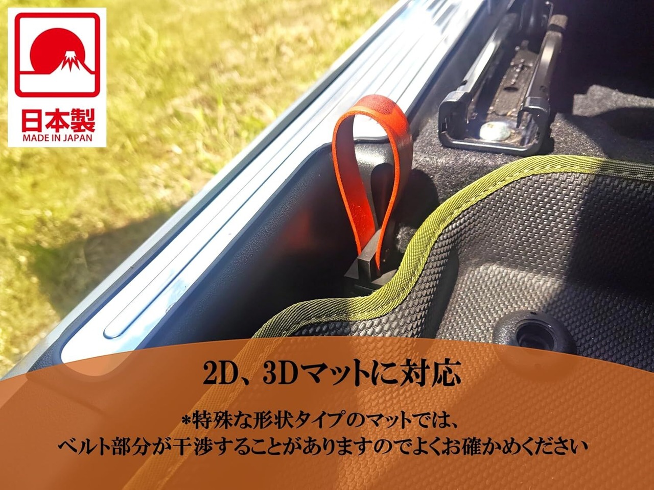 ※ 2D、3Dマットにも対応しておりますが、一部の特殊な形状のマットでは本革ベルト部分が干渉する場合がございますので、使用するフロアマットの形状をお確かめください。