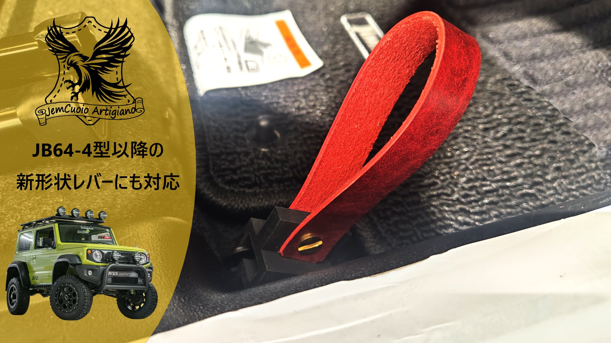 ジムニー(JB64-4型以降)、ジムニーシエラ(JB74-4型以降)、ジムニーノマド(JC74)に採用されている新形状の給油口開閉レバーにも対応するよう設計しています(新形状レバーでは取り付け後は本革ベルトは前傾斜になります)