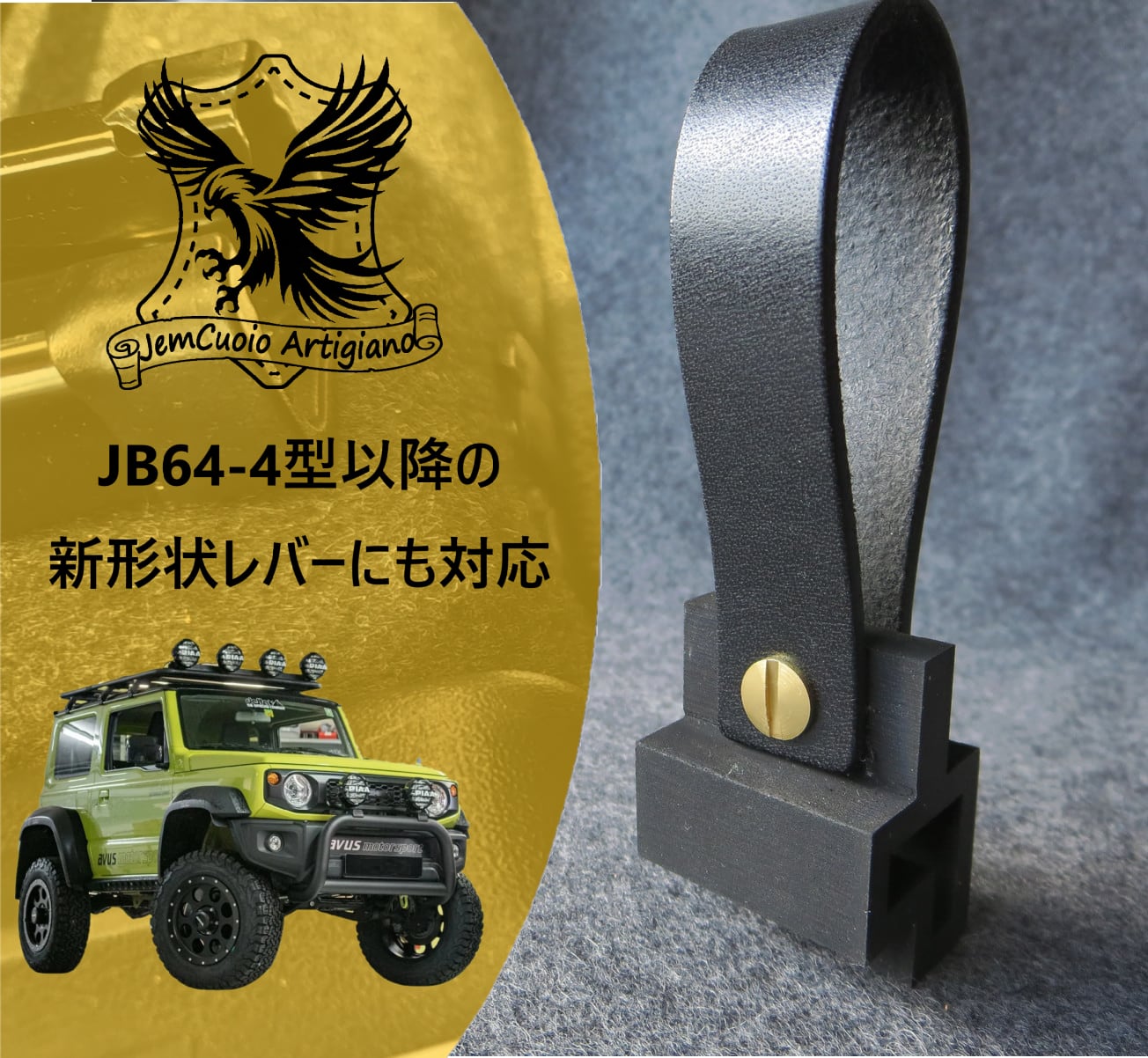 ジムニー(JB64-4型以降)、ジムニーシエラ(JB74-4型以降)、ジムニーノマド(JC74)に採用されている新形状の給油口開閉レバーにも対応するよう設計しています(新形状レバーでは取り付け後は本革ベルトは前傾斜になります)